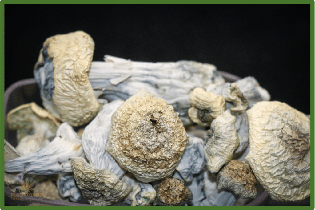 Albino Cambodian shrooms are known for their energetic and long lasting trips with above average strength. This makes it a popular strain for many psychonauts. This strain is good for insightful introspection as well as parties on the moon.